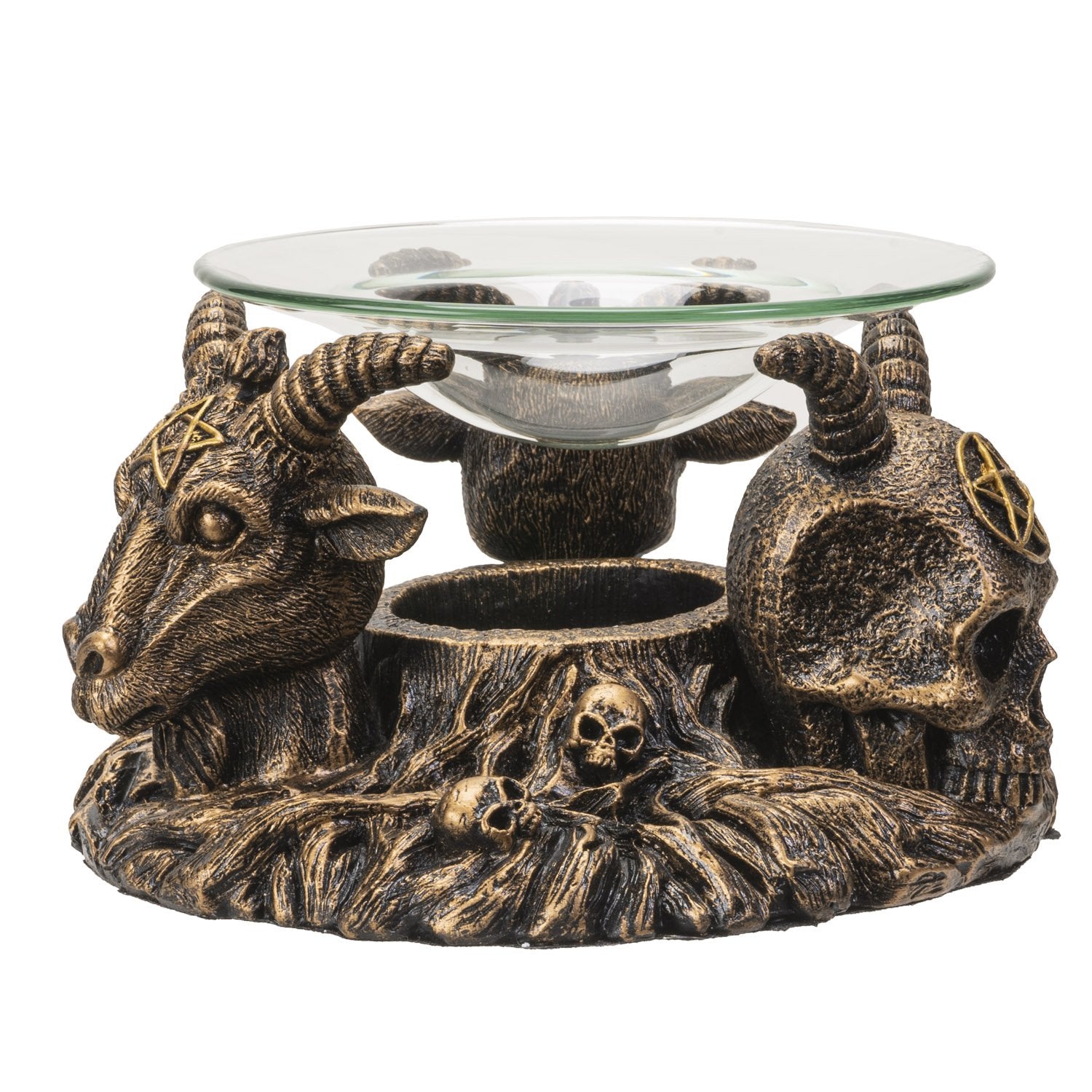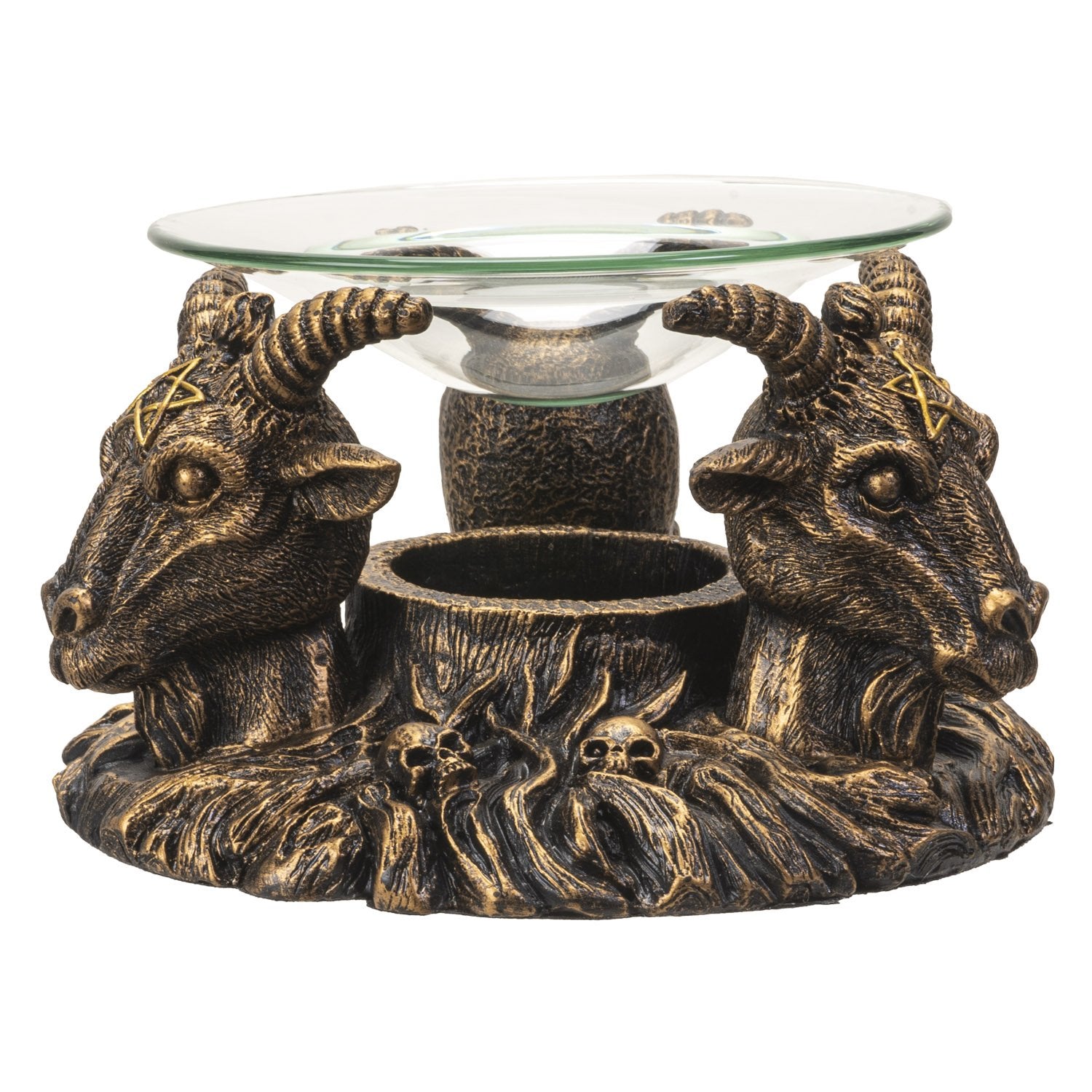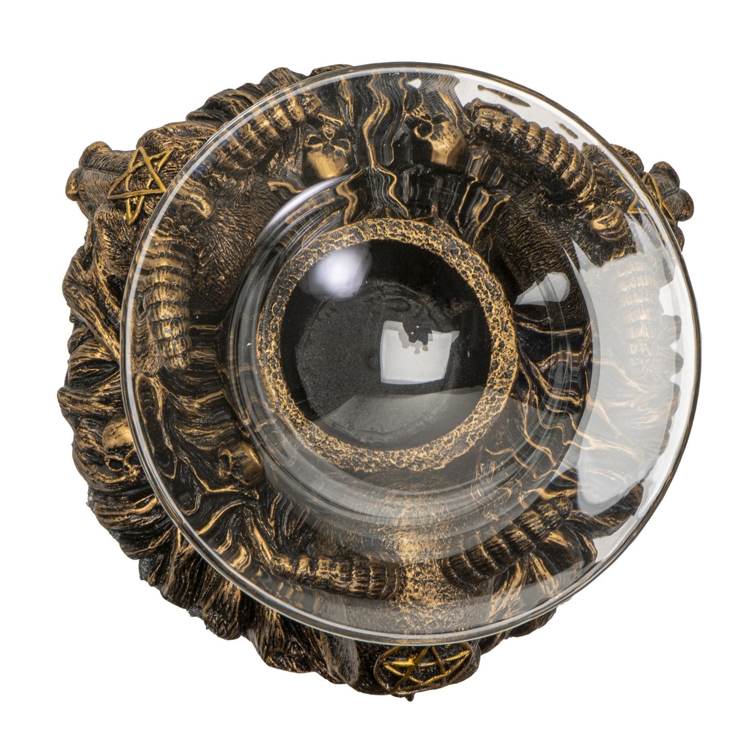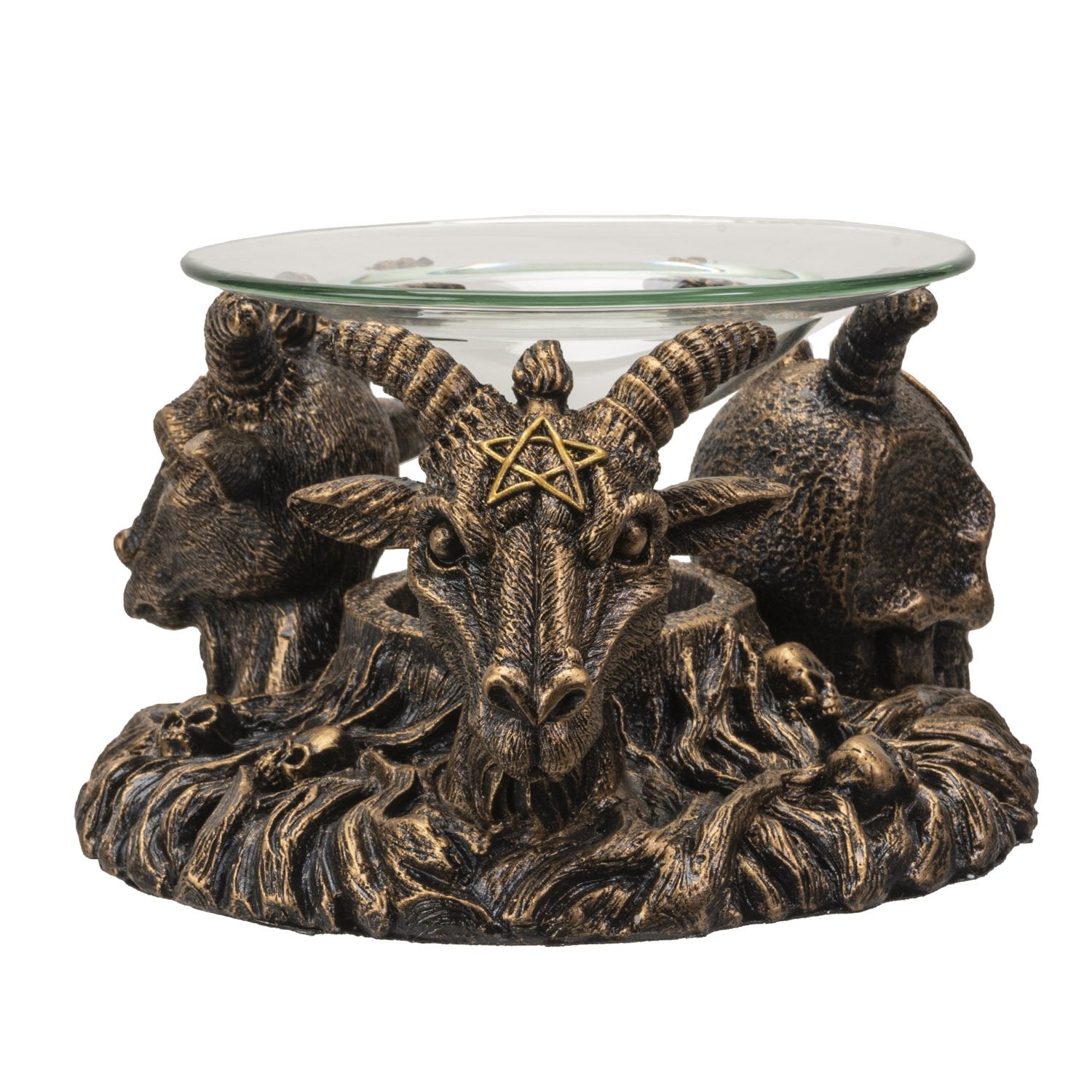 Baphomet Oil Burner a creative display of an oil burner for any Wicca lover cast from the finest resin the artist captures what appears to be a tree stump with 3 heads above the surface each with a pentagram on there foreheads. Horns to hold the glass tray for any oil fragrance or wax fragrance. A decorative piece to add to your Halloween decor.