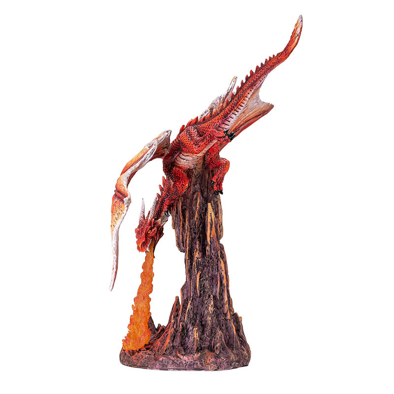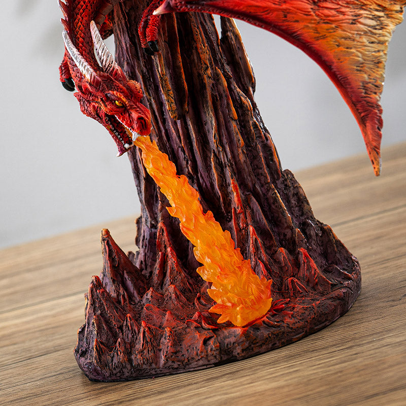 Fury Fire Dragon Sculpture Breathing Fire Over Volcanic Rock Base