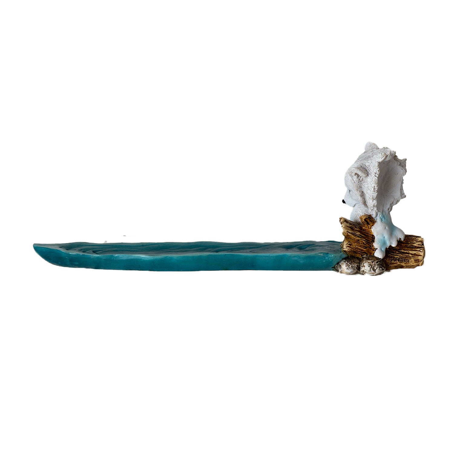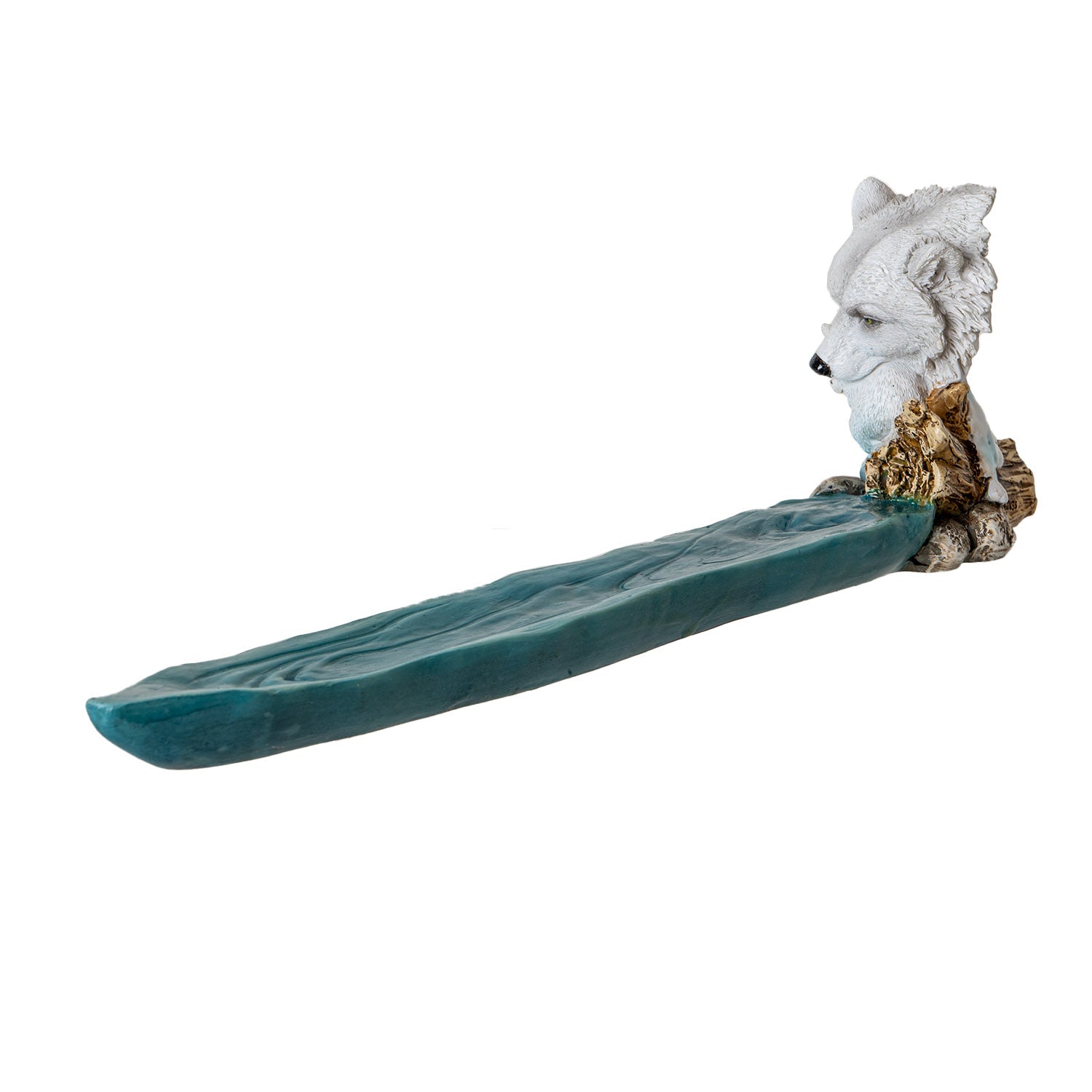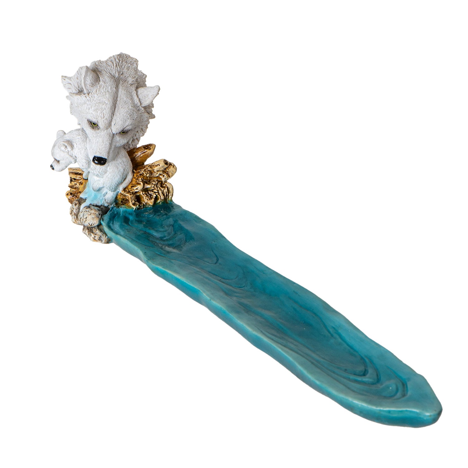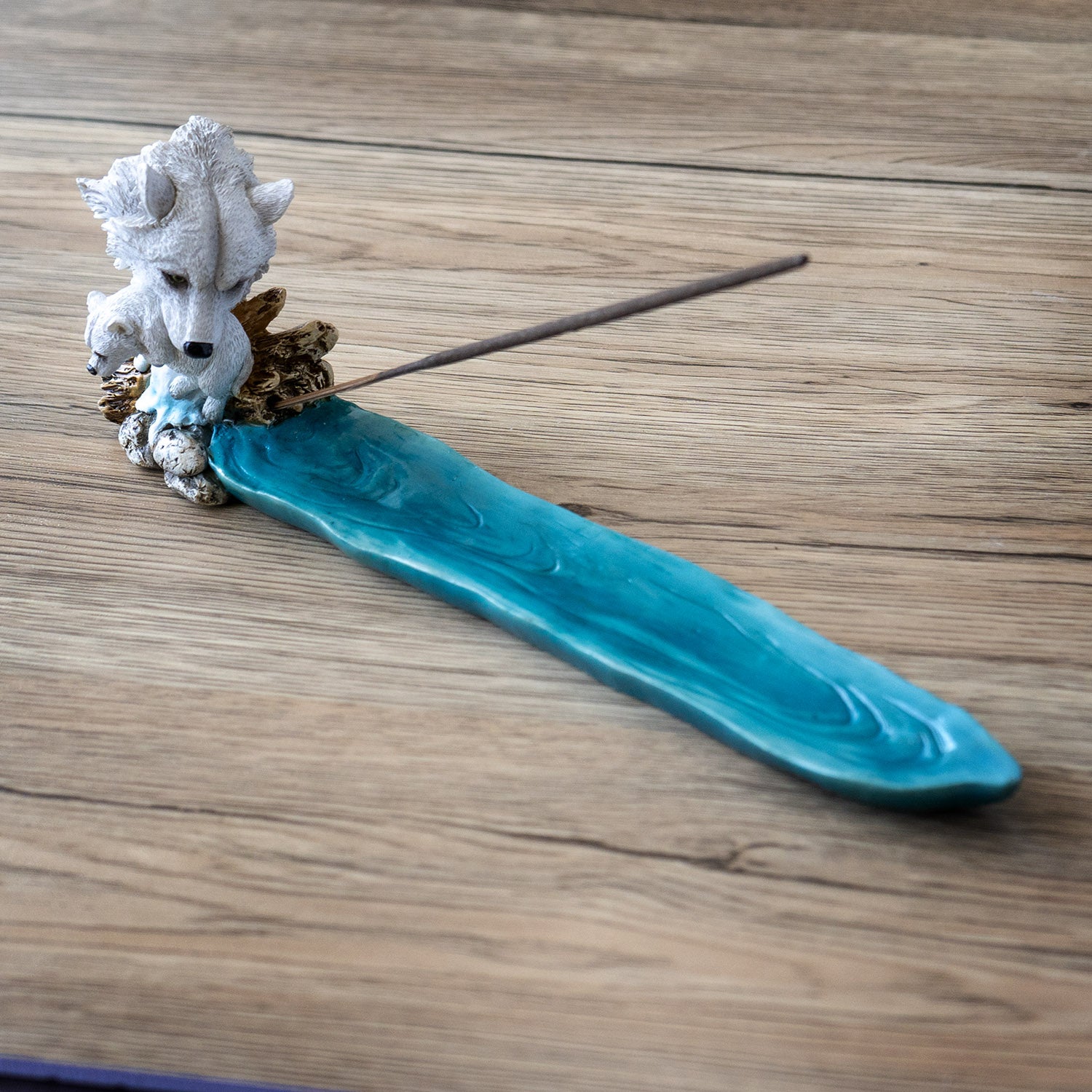 - [Detailed Design]: This incense holder features a white wolf and its playful pup perched beside a flowing river, beautifully capturing the serenity and majesty of nature.